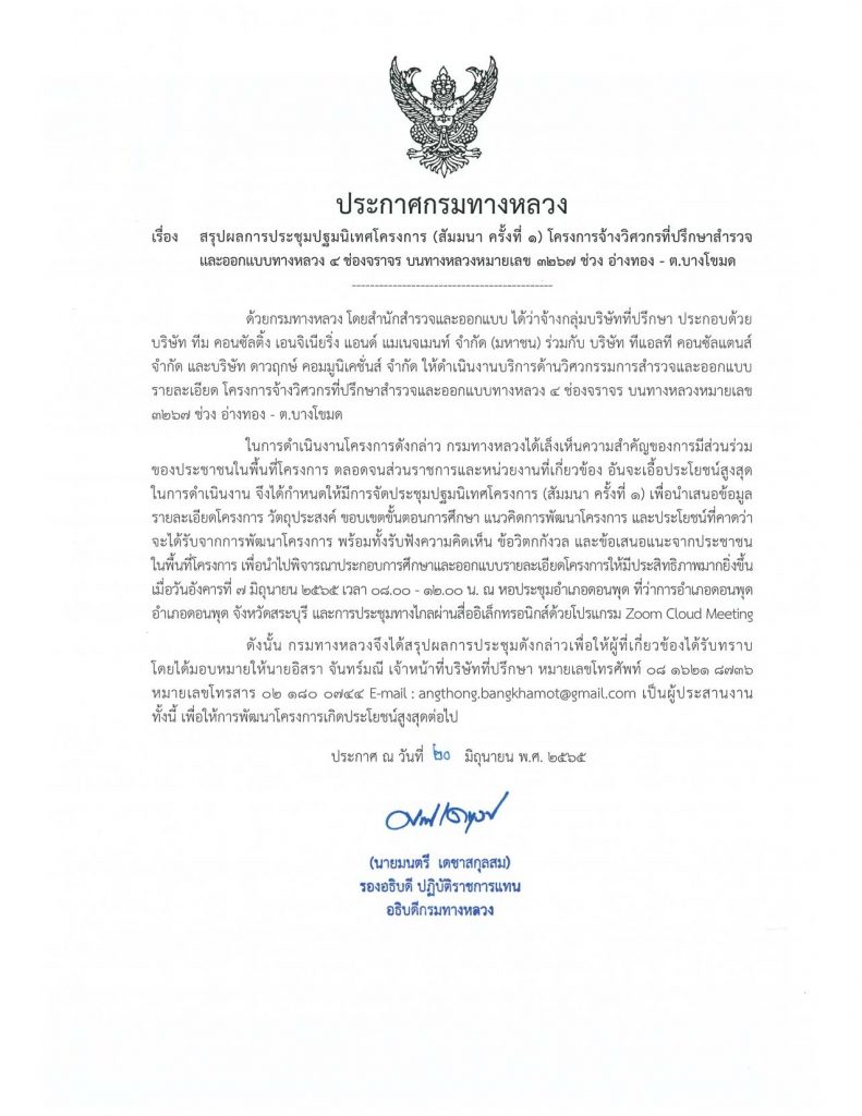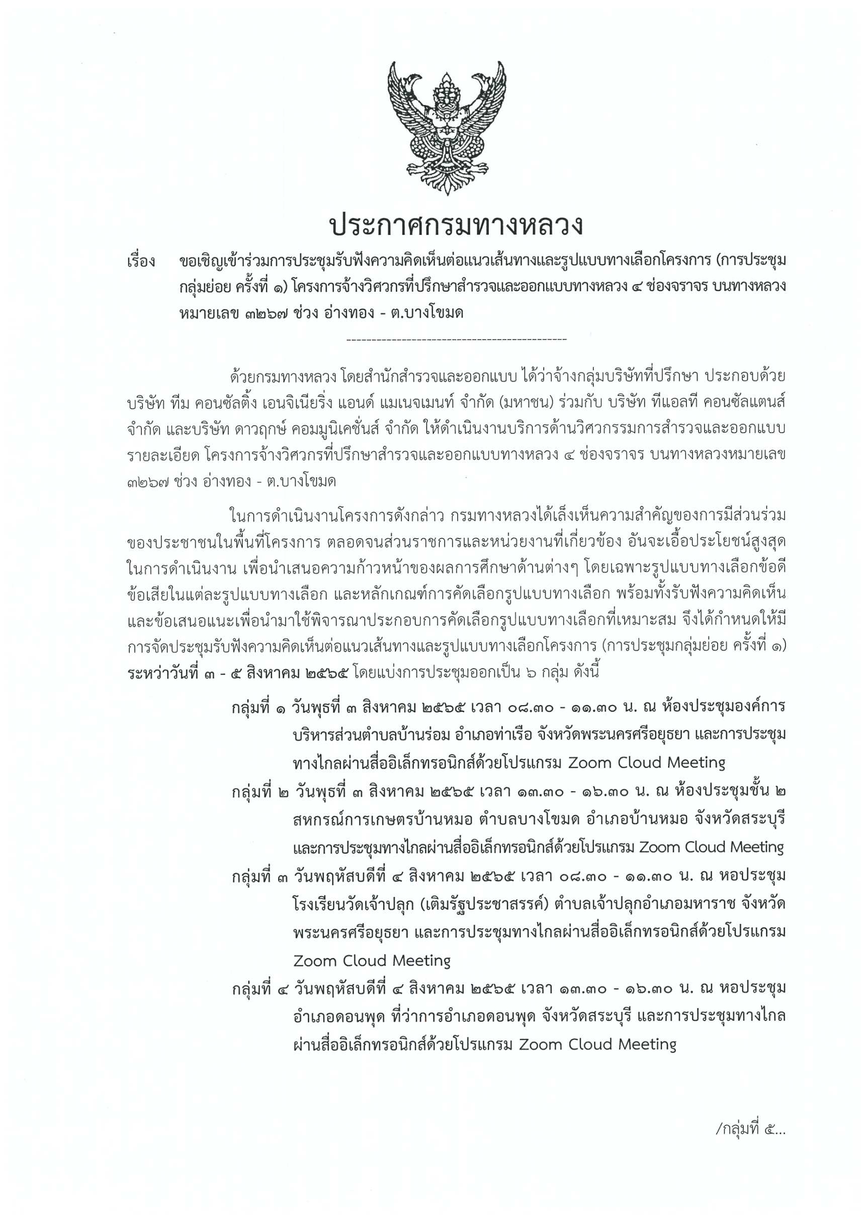 ประกาศกรมทางหลวง เรื่อง ขอเชิญเข้าร่วมการประชุมกลุ่มย่อย ครั้งที่ 1